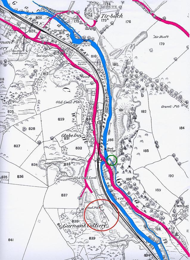 Section of map, showing location of Garnant Colliery, circled in RED.