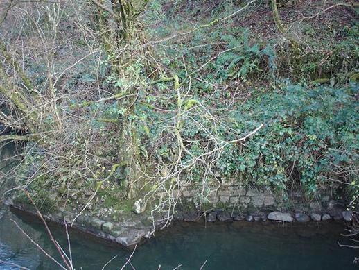 This view from the two counties road bridge in Garnant, shows the location where the water wheel once stood. The wheel was positioned in a gulley behind the wall. The location can be seen in the 1878 map displayed in this gallery.